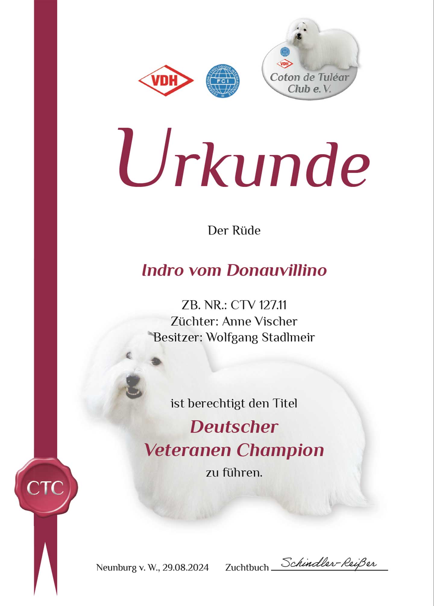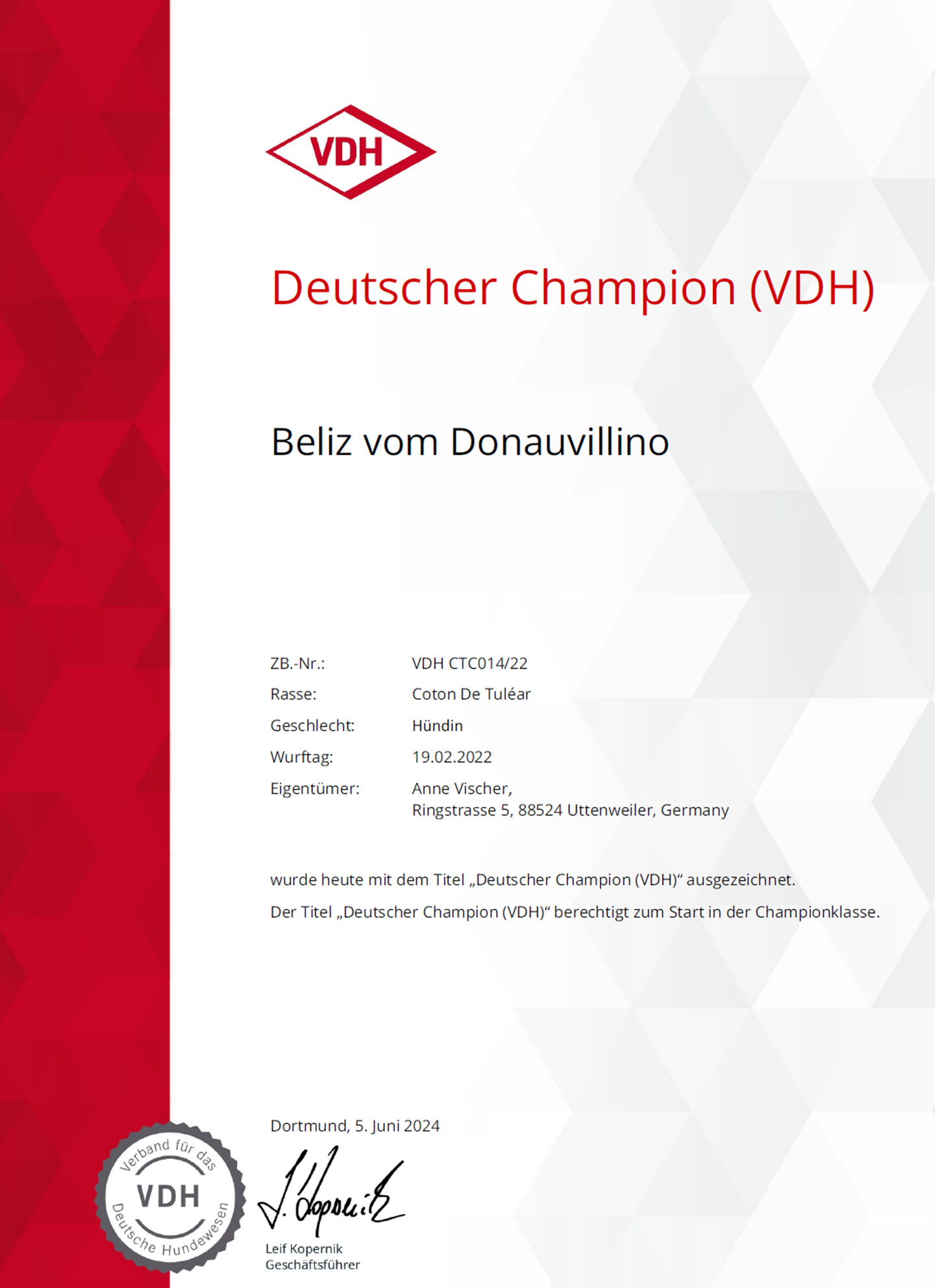 Bernike vom Donauvillino is German Champion CTV and German Champion VDH.