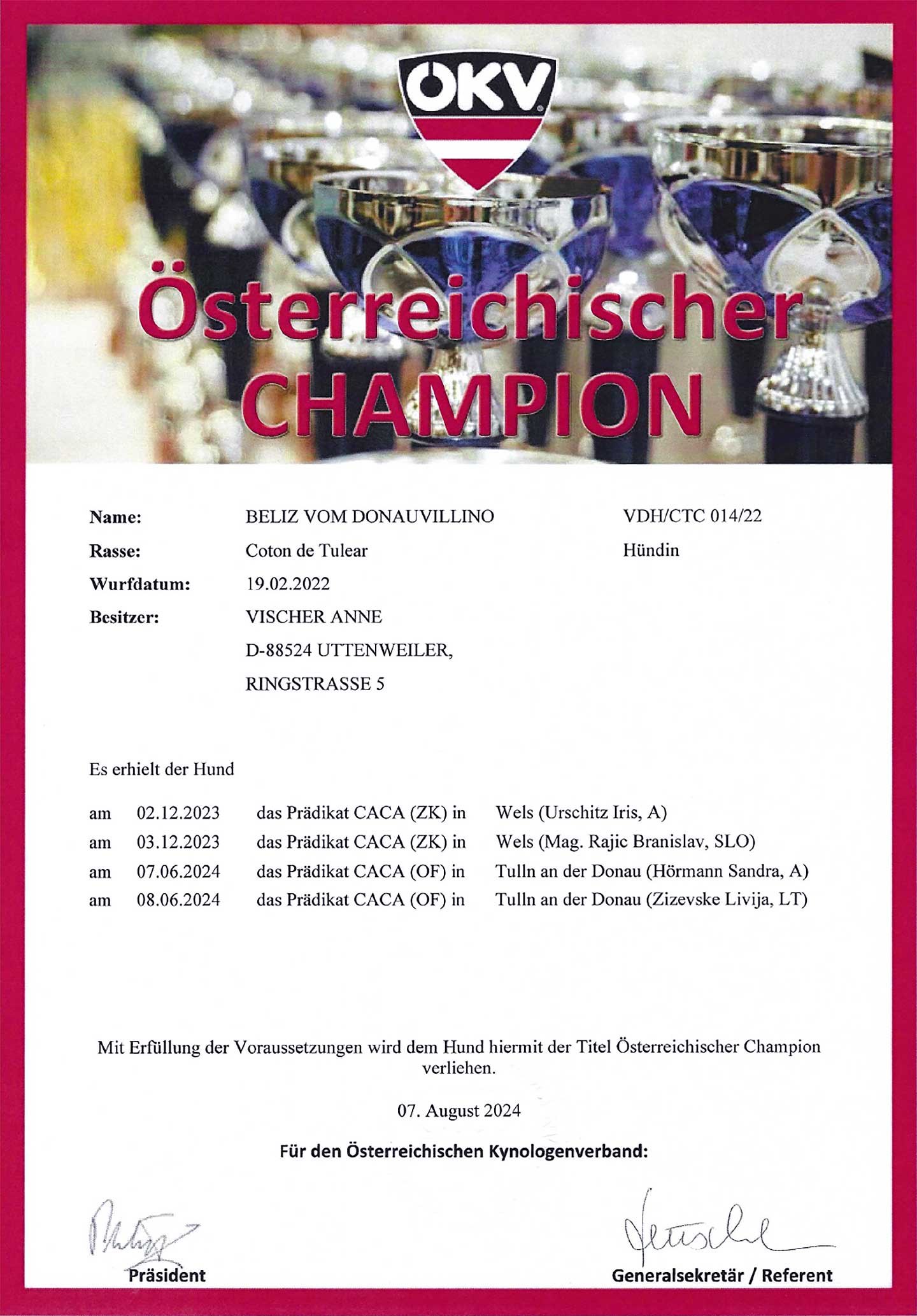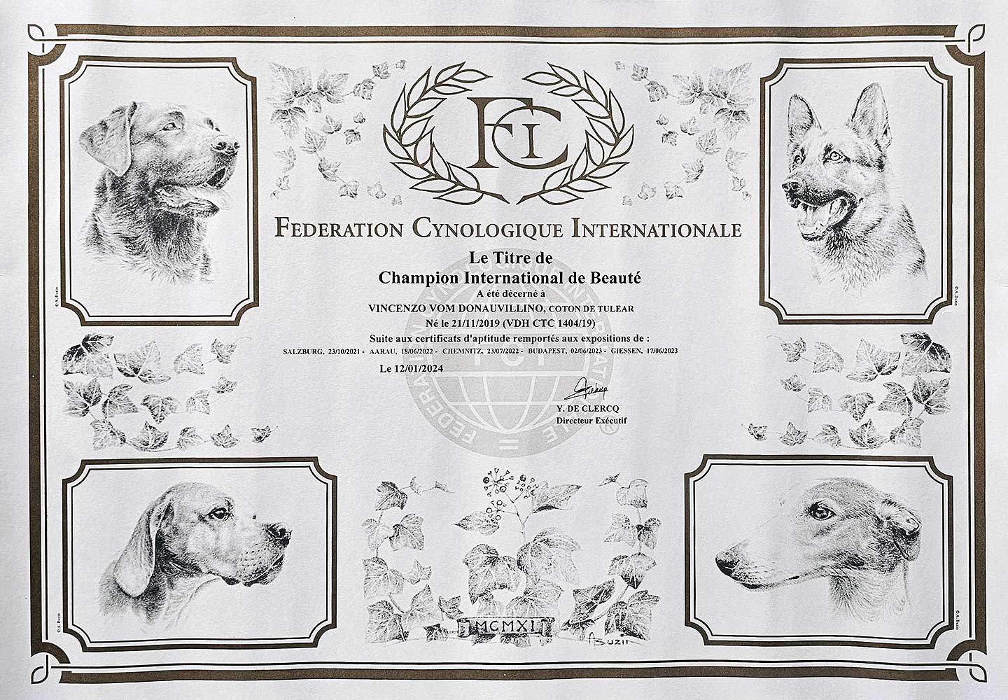 CALVIN vom Donauvillino was the first international champion who was bred in Germany and also lived in Germany.